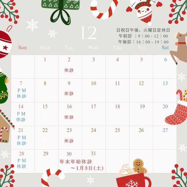 年末年始は12/30(火)-1/3(土)が休診となります🙇♀️